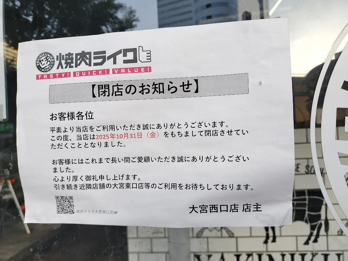 オープンから5年8ヶ月にわたって親しまれてきた「焼肉ライク 大宮西口店」は、惜しまれつつも2025年10月31日(金)をもって閉店となりました。閉店は寂しいですが、今後は、近隣店舗をご利用ください。